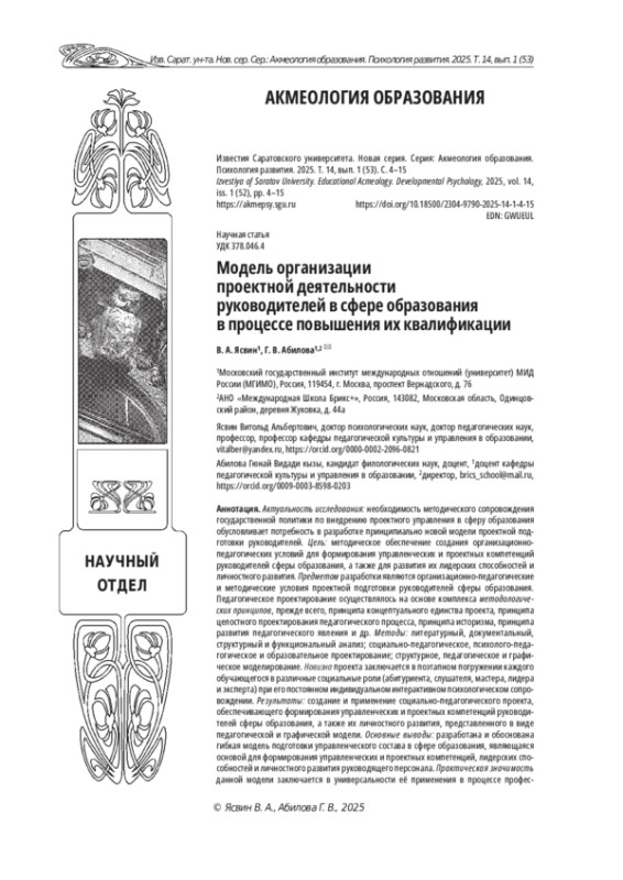 Результаты: создание и применение социально-педагогического проекта, обеспечивающего формирования управленческих и проектных компетенций руководителей сферы образования, а также их личностного развития, представленного в виде педагогической и графической модели. Основные выводы: разработана и обоснована гибкая модель подготовки управленческого состава в сфере образования, являющаяся основой для формирования управленческих и проектных компетенций, лидерских способностей и личностного развития руководящего персонала. Практическая значимость данной модели заключается в универсальности её применения в процессе профессиональной подготовки руководителей любого уровня и педагогического состава в сфере образовании, а также управленческого состава и специалистов, задействованных в других сферах народного хозяйства при соответствующей методической доработке.