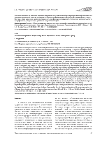 Результаты: выявлены два важнейших интрапсихических регулятора трансформационной одаренности, которые выступают необходимой основой превращения ресурса дарования в трансформационную одаренность – устойчивая профессиональная идентичность, связанная с глубокой вовлеченностью и субъективной удовлетворенностью выбранной ролью и сформированным духовно-ценностным отношением к профессии; субъектность, определяющая уровень самоуправления и жизнетворчества личности в социальной среде.