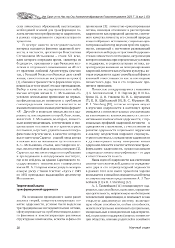 Цель: выявление многомерных доминантных динамических личностных образований, выступающих необходимой основой для трансформации таланта личности в преобразующую одаренность в рамках определенного социокультурного хронотопа. В качестве исследовательского кейса трансформационной одаренности предлагается «архитектура жизни» Константина Степановича Мельникова – выдающегося русского архитектора мирового уровня, новатора, значительно опередившего время, предложившего новый взгляд на смысловое наполнение архитектуры и ее философию, пережившего «золотой сезон» своего триумфа и десятилетия забвения. Феноменологический анализ проводится на основе нарративов самого Мельникова, через реконструкцию его субъективных репрезентаций и понимания себя и мира.