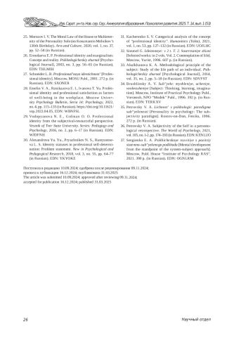 26. Ермолаева Е. П. Профессиональная идентичность и маргинализм: концепция и реальность // Психологический журнал. 2003. № 3. С. 56-65. EDN: THLMIH