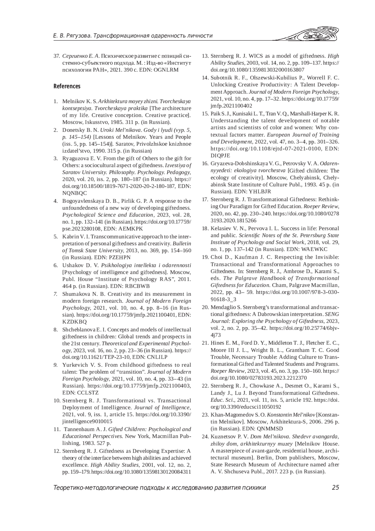 20. Mendaglio S. Sternberg’s transformational and transactional giftedness: A Dabrowskian interpretation // SENG Journal: Exploring the Psychology of Giftedness. 2023. Vol. 2, № 2. P. 35-42. DOI: 10.25774/6bjv-4j73