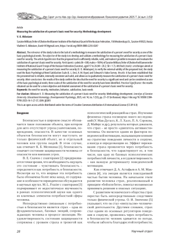 Методы (инструменты): методика, направленная на измерение удовлетворенности базовой потребности личности в безопасности (В. О. Акбутаев); для проверки внешней валидности предложенного инструмента применены методика удовлетворенности базовых психологических потребностей (Э. Л. Деси, Р. М. Райан) и методика диагностики ценностных ориентаций (Ш. Шварц).