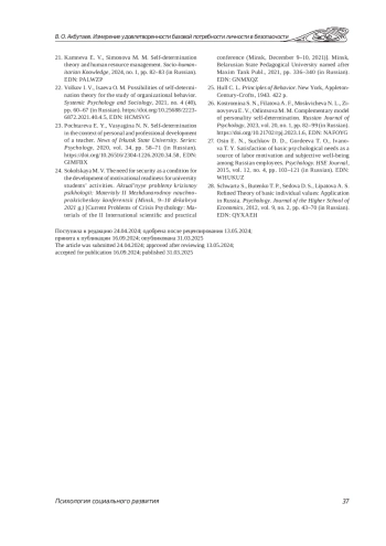 24. Сокольская М. В. Потребность в безопасности как условие развития мотивационной готовности к деятельности студентов вуза // Актуальные проблемы кризисной психологии: материалы II Международной научно-практической конференции (Минск, 9-10 декабря 2021 г.). Минск: Учреждение образования “Белорусский государственный педагогический университет имени Максима Танка”, 2021. С. 336-340. EDN: GNMXQZ