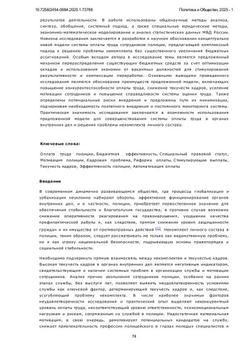 Предметом исследования в данной научной статье является система оплаты труда сотрудников полиции в Российской Федерации, её влияние на их специальный правовой статус и систему оплаты труда, а также анализ причин текучести кадров, выявляя неконкурентоспособный уровень оплаты труда как один из ключевых факторов. Особое внимание уделяется разработке и обоснованию новой модели системы оплаты труда, направленной на стимулирование результативности и компенсацию за переработки, при этом учитывающей бюджетные ограничения и принципы добровольности, справедливости, прозрачности и экономической эффективности. Статья детально раскрывает структуру предлагаемой модели, включающей сохранение базовых элементов денежного довольствия и введение дополнительных выплат, а также обосновывает необходимость автоматизации процессов учета переработок и оценки результатов деятельности. В работе использованы общенаучные методы анализа, синтеза, обобщения, системный подход, а также специальные юридические методы, экономико-математическое моделирование и анализ статистических данных МВД России. Новизна исследования заключается в разработке и научном обосновании концептуально новой модели системы оплаты труда сотрудников полиции, предлагающей комплексный подход к решению проблемы некомплекта без существенного увеличения бюджетных ассигнований. Особым вкладом автора в исследование темы является предложенный механизм перераспределения существующих бюджетных средств за счет оптимизации окладов и использования экономии от вакантных должностей для стимулирования результативности и компенсации переработок. Основными выводами проведенного исследования являются обоснование преимуществ предложенной модели, включающих повышение конкурентоспособности оплаты труда, снижение текучести кадров, усиление мотивации сотрудников и повышение справедливости системы оценки труда. Также определены потенциальные риски внедрения и предложены пути их минимизации, подчеркивая необходимость поэтапного внедрения и постоянного мониторинга системы. Практическая значимость исследования заключается в возможности использования предложенной модели для совершенствования системы оплаты труда в органах внутренних дел и решения проблемы некомплекта личного состава.
