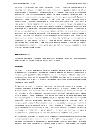 Миграция приводит к значительным изменениям в социальных ролях мужчин и женщин в современном Вьетнаме. Миграционный процесс не только отражает экономическое развитие, но и демонстрирует глубокие изменения в структуре семьи, гендерных отношениях и экономических обязанностях. Данная статья посвящена анализу влияния миграции на изменение социальных ролей мужчин и женщин на основе данных опроса и глубинных интервью в коммуне Винь Трач Донг, провинция Бак Лиеу. Основные методы, использованные в данном исследовании, включают анкетные опросы (N=811) домохозяйств, в которых молодые люди мигрируют из сельской местности в города, и глубинные интервью (N=20) жителей этих сообществ для уточнения анализа на основе наблюдения или сбора имеющихся данных. Сочетание количественных и качественных методов помогает прояснить изменения в трудовых ролях, семейных обязанностях и социальной осведомленности о гендере. Результаты исследований показывают, что женщины-мигранты берут на себя основную трудовую роль, а оставшиеся мужчины постепенно адаптируются к работе по уходу за семьей. Однако это изменение также усиливает давление на оба пола, тем самым создавая острую необходимость в политике поддержки и защиты трудящихся-мигрантов. Кроме того, в исследовании также предлагаются решения по повышению гендерного равенства, улучшению условий труда и оказанию психологической и социальной поддержки как мужчинам, так и женщинам в контексте растущей миграции во Вьетнаме. В частности, в статье подчеркивается, что миграционный процесс является не только экономическим явлением, но и основной движущей силой изменения традиционных представлений о гендере. Тот факт, что женщины играют ключевую экономическую роль, помогает им занимать более высокое положение в семье и обществе. Напротив, мужчины постепенно принимают на себя работу по дому и уходу за детьми, разрушая жесткую модель гендерного разделения труда. Эти изменения требуют гибкой адаптации со стороны заинтересованных сторон, и необходима долгосрочная политика для поддержки этого перехода на устойчивой основе.