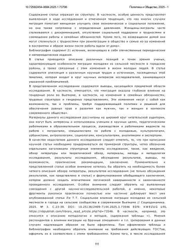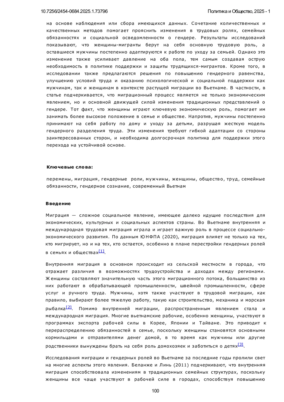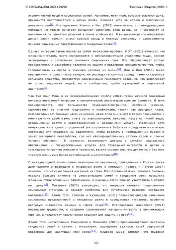 3. Нгуен Л. Т., Фам Т. Т. Миграция и гендерные роли во Вьетнаме: социально-экономическая перспектива // Азиатский журнал социальных наук. 2022. Т. 50, № 3. С. 45-67.