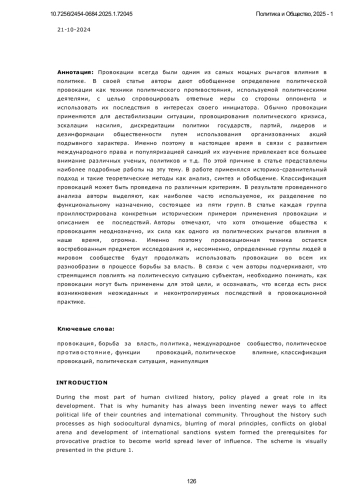 Провокации всегда были одним из самых мощных рычагов влияния в политике. В статье авторы дают обобщённое определение политической провокации как метода политической конфронтации, используемого политическими субъектами с целью спровоцировать ответные меры со стороны противника и использовать их последствия в интересах инициатора провокации. Обычно провокации применяются для дестабилизации ситуации, провоцирования политического кризиса, эскалации насилия, дискредитации политики государств, партий, лидеров и дезинформации общественности с помощью организованных действий подрывного характера. Именно поэтому в наши дни, в связи с развитием международного права и популяризацией санкций, их изучение привлекает всё больше внимания учёных, политиков и т. д. По этой причине в тексте упоминаются наиболее подробные и исчерпывающие работы по данной теме. Исследование основано на историко-сравнительном подходе и таких теоретических методах, как анализ, синтез и обобщение. В результате исследования была проведена современная классификация провокаций по различным критериям. Однако авторы отмечают, что наиболее популярной является классификация по функциональному назначению, включающая пять групп. В статье каждая группа проиллюстрирована конкретным историческим примером применения провокации и описанием её последствий. Авторы отмечают, что, хотя отношение общества к провокациям неоднозначно, потенциальная сила таких действий в плане влияния на политические результаты значительна. По этой причине провокационные методы остаются предметом значительного интереса и изучения для исследователей. Представляется неизбежным, что определённые группы в мировом сообществе будут продолжать использовать провокации в самых разных формах в своём стремлении к власти. В связи с этим авторы подчёркивают, что субъекты, стремящиеся повлиять на политическую ситуацию, должны понимать, как можно использовать провокацию в этих целях, и осознавать, что провокационные действия всегда сопряжены с риском неожиданных и неконтролируемых последствий.