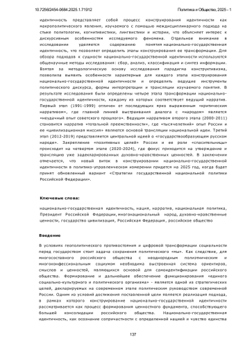 В статье рассматриваются этапы трансформации и содержание понятия национально-государственной идентичности современной России. В теоретико-методологической части исследование опирается на работы известных российских и зарубежных политологов, социологов и психологов. Эмпирической базой исследования служат документы стратегического планирования (стратегии национальной политики), послания федеральному собранию Президента России и его публичные выступления. Авторы отмечают, что современная российская национально-государственная идентичность представляет собой процесс конструирования идентичности как макрополитического явления, изучаемого с помощью междисциплинарного подхода на стыке политологии, когнитивистики, лингвистики и истории, что объясняет интерес к дискурсивным особенностям исследуемого феномена. Отдельное внимание в исследовании уделяется содержанию понятия национально-государственная идентичность, что позволяет определить этапы конструирования ее трансформации. Для обзора подходов к сущности национально-государственной идентичности используются общенаучные методы исследования: сбор, анализ, классификация и синтез информации. Взятая за методологическую основу исследования парадигма конструктивизма, позволила выявить особенности характерные для каждого этапа конструирования национально-государственной идентичности и определить ведущие инструменты политического дискурса, формы интерпретации и трансляции изучаемого понятия. В результате исследования были определены четыре этапа трансформации национально-государственной идентичности, каждому из которых соответствует ведущий нарратив. Первый этап (1991-1999) отличен от последующих ярко выраженным «критическим нарративом», где главной линией выстраивания диалога с «народом» является «неудачный опыт советского прошлого». Ведущим нарративом второго этапа (2000-2011) становится нарратив «тотальной преемственности», где «тысячелетний» опыт России и ее «цивилизационная миссия» являются основой трансляции национальной идеи. Третий этап (2012-2019) представляется центральной идеей о «государствообразующем русском народе». Закрепление «позитивных целей» России и ее роли «спасительницы» происходит на четвертом этапе (2020-2024), где фокус приходится на утверждение и трансляцию уже задекларированных духовно-нравственных ценностей. В заключении отмечается, что новый виток в конструировании национально-государственной идентичности в политико-управленческом измерении придется на 2025 год, когда будет принят обновленный вариант «Стратегии государственной национальной политики Российской Федерации».