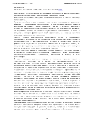 В условиях геополитического противостояния и цифровой трансформации социальности перед государством стоит задача сохранения политического «мы». Как следствие, для многосоставного российского общества с неоднородным полиэтническим и многоконфессиональным социумом необходима выстроенная система ориентиров, смыслов и ценностей, являющихся основой для самоидентификации российского общества. Формирование и дальнейшее обеспечение функционирования «единого социально-культурного и политического организма» - является одной из стратегических целей, декларируемых на современном этапе политическим руководством современной России.