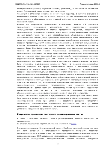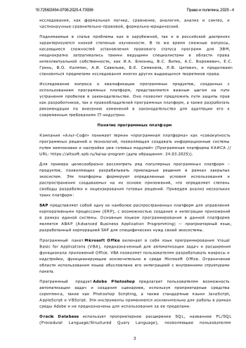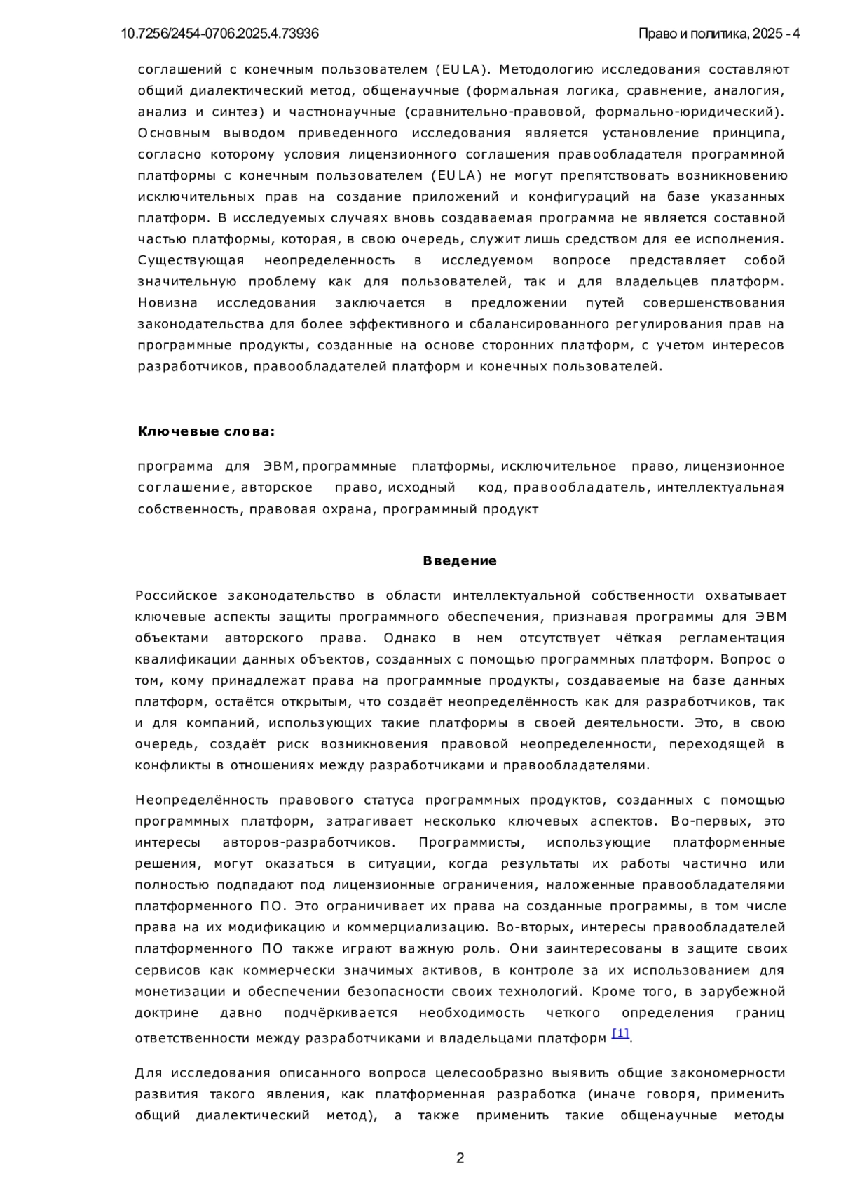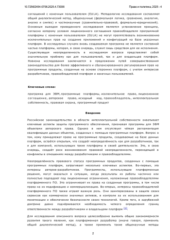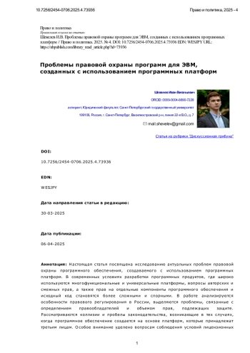 Настоящая статья посвящена исследованию актуальных проблем правовой охраны программного обеспечения, создаваемого с использованием программных платформ. В современных условиях разработки программных продуктов, где широко используются многофункциональные и универсальные платформы, вопросы авторских и смежных прав, а также прав на отдельные компоненты программного обеспечения и исходный код становятся более сложными и спорными. В работе анализируются особенности правового регулирования в России, выделяются проблемы, связанные с определением правообладателей и объемом прав, подлежащих защите. Рассматриваются коллизии и пробелы законодательства, возникающие в тех случаях, когда программное обеспечение создается на основе платформ, которые принадлежат третьим лицам. Особое внимание уделено вопросам соблюдения условий лицензионных соглашений с конечным пользователем (EULA). Методологию исследования составляют общий диалектический метод, общенаучные (формальная логика, сравнение, аналогия, анализ и синтез) и частнонаучные (сравнительно-правовой, формально-юридический). Основным выводом приведенного исследования является установление принципа, согласно которому условия лицензионного соглашения правообладателя программной платформы с конечным пользователем (EULA) не могут препятствовать возникновению исключительных прав на создание приложений и конфигураций на базе указанных платформ. В исследуемых случаях вновь создаваемая программа не является составной частью платформы, которая, в свою очередь, служит лишь средством для ее исполнения. Существующая неопределенность в исследуемом вопросе представляет собой значительную проблему как для пользователей, так и для владельцев платформ. Новизна исследования заключается в предложении путей совершенствования законодательства для более эффективного и сбалансированного регулирования прав на программные продукты, созданные на основе сторонних платформ, с учетом интересов разработчиков, правообладателей платформ и конечных пользователей.