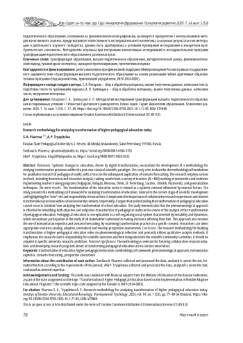 Выводы. Методология исследования трансформации высшего педагогического образования, основанная на феноменологической рефлексии, реализуется приоритетно с использованием методов качественного анализа, предусматривает ответственность исследовательского коллектива за научные результаты и их интеграцию в деятельность научного сообщества, должна быть адаптирована к условиям проведения исследования в конкретном вузе. Практическая значимость. Методология актуальна при построении коллективных исследований и исследовательских программ трансформации педагогического образования в различных вузах.