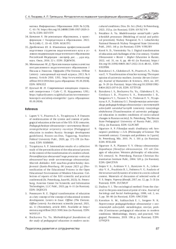 1. Лаптев В. В., Писарева С. А., Тряпицына А. П. Особенности модернизации системы и содержания педагогического образования на рубеже ХХ-XXI веков // Педагогическое образование в современной России: стратегические ориентиры развития. Ростов-н/Д; Таганрог: Южный федеральный университет, 2020. С. 172-191. EDN: SIHMHS