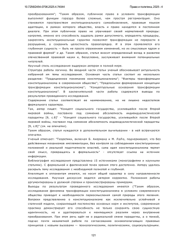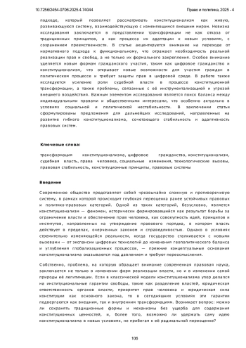 Актуальность темы статьи обусловлена необходимостью изучения трансформации конституционализма в современном обществе в ответ на динамичные изменения в социальных, политических и технологических сферах. В условиях глобализации и цифровизации важность адаптации конституционного порядка становится все более очевидной, что и является предметом исследования данной работы. Где трансформация конституционализма - это не простое следствие юридической эволюции или механической адаптации к внешним условиям, а результат глубинных процессов, происходящих в правовом сознании, политической культуре и самой структуре власти. Она затрагивает не только формы, но и сущность: изменяется представление о легитимности публичной власти, перераспределяются акценты между публичной и частной автономией, между универсальными правами и конкретными мерами правозащиты. В качестве основного метода исследования используется концептуальный анализ, направленный на выявление основных тенденций и механизмов трансформации конституционализма. Методология исследования основана на системном подходе, который позволяет рассматривать конституционализм как живую, развивающуюся систему, взаимодействующую с изменяющимся внешним миром. Новизна исследования заключается в представлении трансформации не как отказа от традиционных принципов, а как процесса их адаптации к новым условиям, с сохранением преемственности. В статье акцентируется внимание на переходе от нормативного подхода к функциональному, что отражает необходимость реальной реализации прав и свобод, а не только их формального закрепления. Особое внимание уделяется новым формам гражданского участия, таким как цифровое гражданство и конституционализм, что открывает новые возможности для участия граждан в политическом процессе и требует защиты прав в цифровой среде. В работе также исследуется усиление роли судебной власти в процессе конституционной трансформации, а также проблемы, связанные с её инструментализацией и угрозой внешнего воздействия. Важным элементом исследования является поиск баланса между индивидуальными правами и общественными интересами, что особенно актуально в условиях социальной и политической нестабильности. В заключении статьи сформулированы предложения для дальнейших исследований, направленных на развитие гибкого конституционализма, сочетающего стабильность и адаптивность правовых систем.