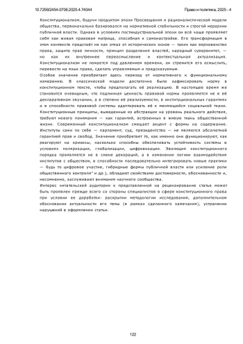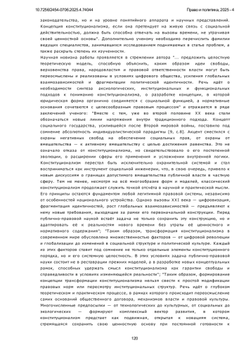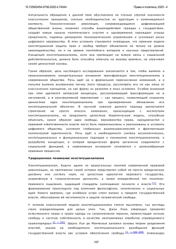 Современное общество представляет собой чрезвычайно сложную и противоречивую систему, в рамках которой происходит глубокая переоценка ранее устойчивых правовых и политико-правовых категорий. Одной из таких категорий, безусловно, является конституционализм — феномен, исторически формировавшийся как результат борьбы за ограничение власти и обеспечение прав человека, как совокупность идей, принципов и институтов, направленных на утверждение правового порядка, в котором власть действует в пределах, очерченных законом и справедливостью. Однако в условиях стремительно изменяющейся реальности, когда государство сталкивается с новыми вызовами — от экспансии цифровых технологий до изменения геополитического баланса и углубления глобализационных процессов, — прежние концептуальные основания конституционализма оказываются под давлением и требуют переосмысления.