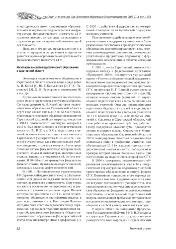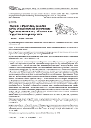 Заключение: обобщен опыт трансформации педагогического образования в Саратовском государственном университете. Выявлены стратегии и перспективы развития, обусловленные общественным запросом и актуальной социокультурной ситуацией. Определена единая образовательная, воспитательная и научно-исследовательская повестка Педагогического института СГУ, направленная на синтез глубокого предметного знания и инновационных методик обучения, практикоориентированных аудиторных занятий и внеаудиторных событий, тесного сотрудничества и взаимодействия с образовательными организациями, способствующая формированию традиционных ценностей, профессионально-личностных качеств и проактивного поведения педагогов, необходимых для успешной профессиональной деятельности. Практическая значимость: тиражирование опыта Саратовской школы высшего педагогического образования.