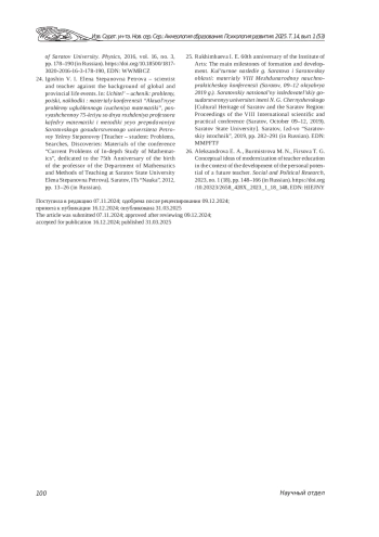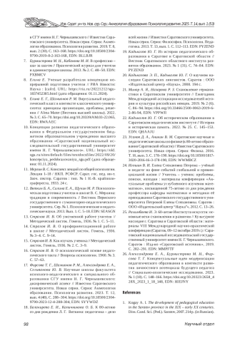 17. Фирсова Т. Г., Шамионов Р. М., Александрова Е. А., Селиванова Ю. В. Научные школы факультета психолого-педагогического и специального образования СГУ имени Н. Г. Чернышевского: диахронический аспект // Известия Саратовского университета. Новая серия. Серия: Акмеология образования. Психология развития. 2023. Т. 12, вып. 4 (48). С. 288-304. ,. DOI: 10.18500/2304-9790-2023-12-4-288-304 EDN: SYYWDZ