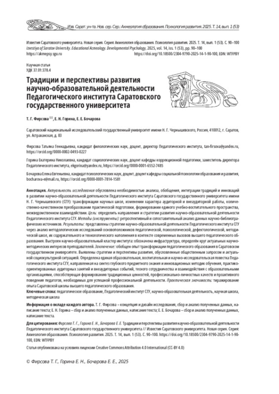 Актуальность исследования обусловлена необходимостью анализа, обобщения, интеграции традиций и инноваций в развитии научно-образовательной деятельности Педагогического института Саратовского государственного университета имени Н. Г. Чернышевского (СГУ): трансформации научных школ, изменении характера аудиторной и внеаудиторной работы, количественно-качественном преобразовании практической подготовки, формировании единого учебно-воспитательного пространства, межведомственном взаимодействии.