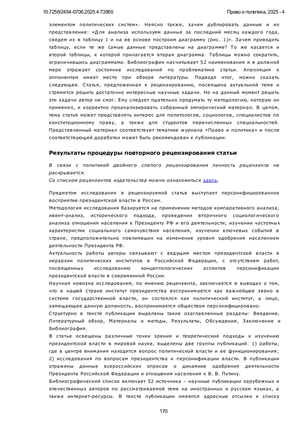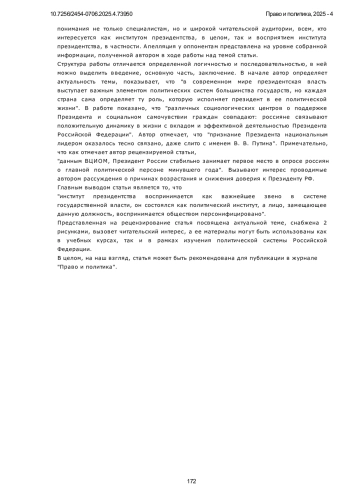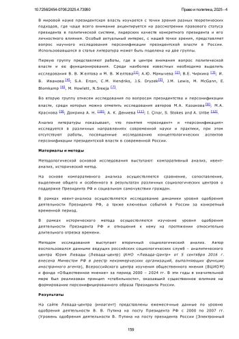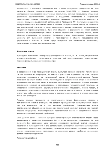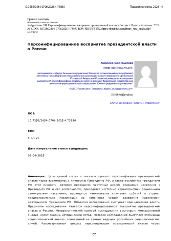 Цель данной статьи - показать процесс персонификации президентской власти через взаимосвязь с личностью Президента РФ, а также восприятие гражданами РФ этой личности. Автором проводится частотный анализ отношения населения к Президенту РФ и его деятельности; приводятся частотные характеристики социального самочувствия населения; проводится ивент-анализ ключевых событий в стране, предположительно повлиявших на изменение уровня одобрения населением деятельности Президента РФ. Объектом исследования выступает президентская власть. Предметом исследования является персонифицированное восприятие президентской власти в России. Методологической основой исследования выступают: компаративный анализ, ивент-анализ, исторический метод. Методом исследования выступает вторичный социологический анализ, основанный на данных ведущих российских социологических служб. Рассматривается процесс персонификации президентской власти через взаимосвязь с личностью Президента РФ, а также восприятие гражданами РФ этой личности. Данные проанализированы за период 2000-2024 гг. Научная новизна исследования заключается в полученных результатах, которые показывают, что данные различных социологических центров о поддержке Президента и социальном самочувствии граждан совпадают: россияне связывают положительную динамику в жизни с вкладом и эффективной деятельностью Президента РФ. Институт президентства воспринимается как важнейшее звено в системе государственной власти, он состоялся как политический институт, а лицо, замещающее данную должность, воспринимается обществом персонифицировано. При этом общество в реальности не имеет особого влияния на государственную власть и готово подчиняться авторитету власти, таким образом отстраняясь от политики. Материалы статьи представляют практическую ценность для выявления проблем и противоречий в области государственного управления в России, а также будут интересны для политологов, социологов, политических технологов и консультантов.