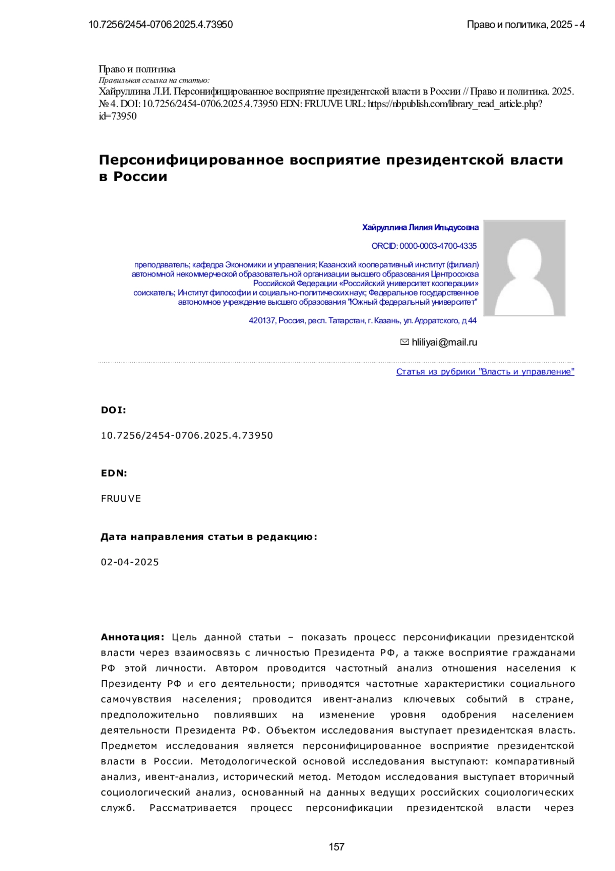 13. Хайруллина Л. И., Идиатуллина К. С. Президент Российской Федерации в зеркале общественного мнения // Вестник экономики, права и социологии. - 2011. - В. 2. - С. 208-213.