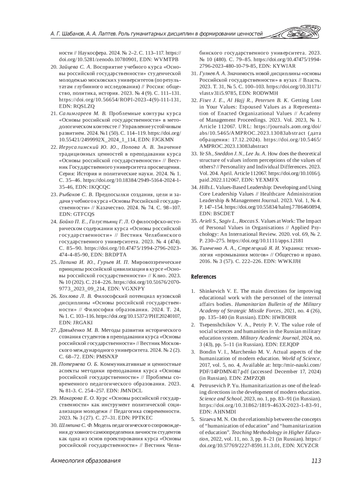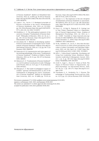 25. Лапина И. Ю., Гурьев И. П. Мировоззренческие принципы российской цивилизации в курсе “Основы российской государственности” // Клио. 2023. № 10 (202). С. 214-226. ,. DOI: 10.51676/2070-9773_2023_09_214 EDN: VGXNPY