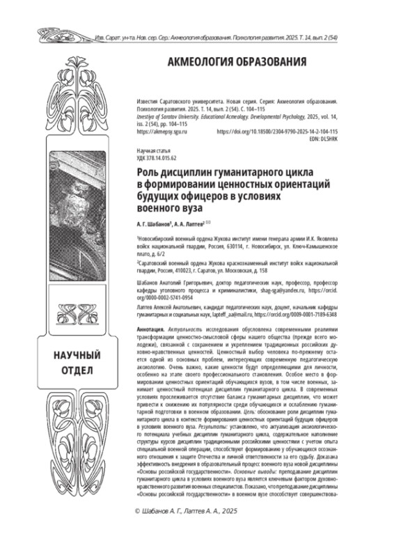 Цель: обоснование роли дисциплин гуманитарного цикла в контексте формирования ценностных ориентаций будущих офицеров в условиях военного вуза.