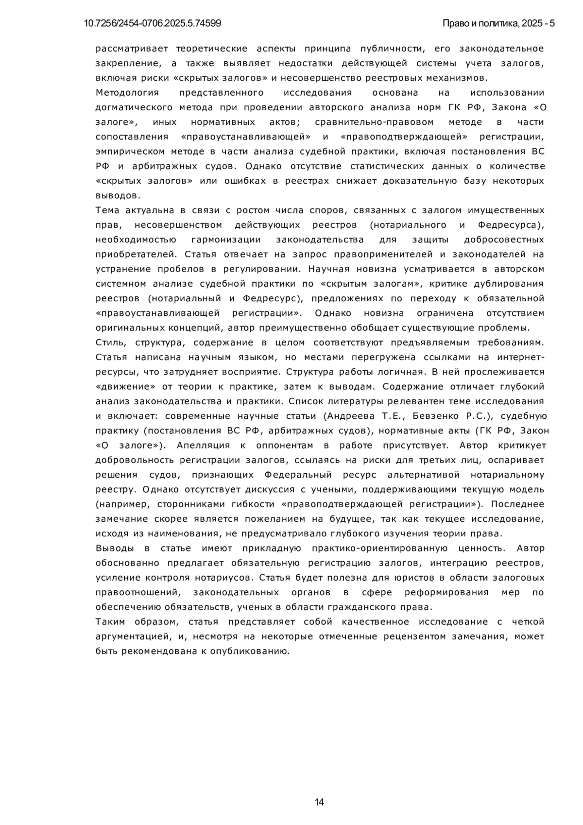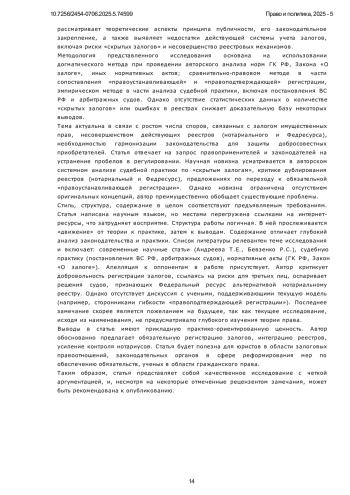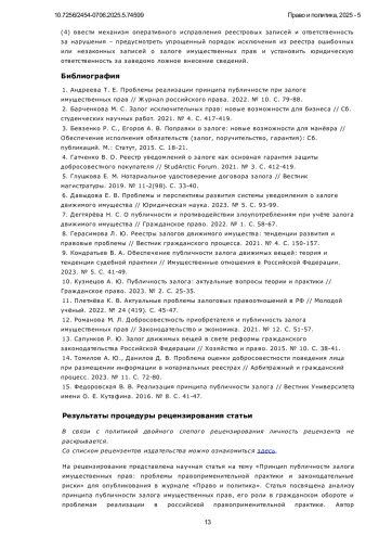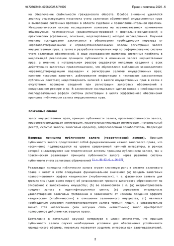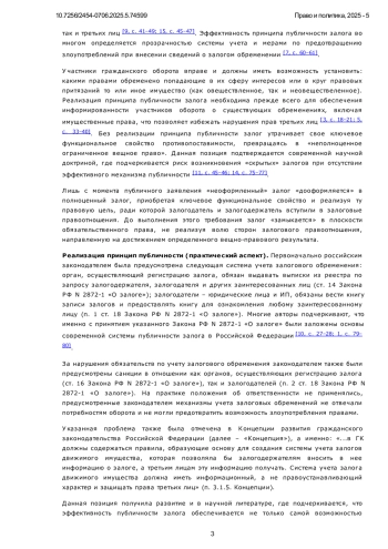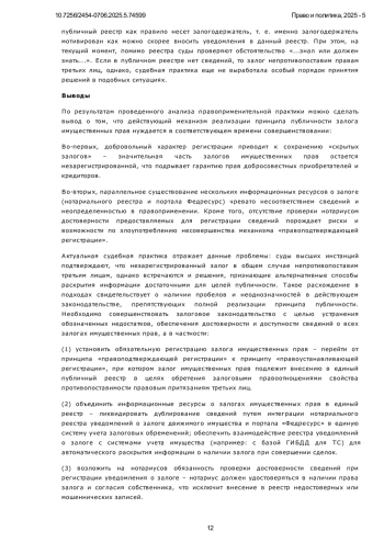 В настоящей статье рассматриваются вопросы правоприменительной реализации принципа публичности в отношении залога имущественных прав в современном российском гражданском праве (предмет исследования). Объектом исследования выступает действующее нормативно-правовое регулирование механизма обеспечения эффекта «видимости» («публичности») залога имущественных прав. Основная задача исследования - выявление недостатков действующего механизма обеспечения эффекта «видимости» («публичности») залога имущественных прав с целью последующей разработки предложений по совершенствованию системы учета залоговых обременений. В исследовании подробно рассматриваются такие аспекты темы, как влияние принципа публичности на защиту прав участников залоговых правоотношений и на обеспечение стабильности гражданского оборота. Особое внимание уделяется анализу существующего механизма учета залоговых обременений имущественных прав и выявлению системных проблем в области судебной и правоприменительной практики. Методологическая основа исследования основана на взаимосвязанном применении общенаучных, частнонаучных (сравнительно-правовой и формально-юридический) и практических (сравнение, описание, моделирование) методов исследования. Научная новизна исследования заключается в обосновании необходимости перехода от «правоподтверждающей» к «правоустанавливающей» модели регистрации залога имущественных прав, а также в разработке конкретных мер по реформированию системы учета залоговых обременений. В ходе исследования выявлены системные проблемы в надлежащей реализации принципа публичности в отношении залога имущественных прав, а именно: в нотариальном реестре содержатся неполные сведения о всех действующих залоговых правоотношениях, что обусловлено выбранным законодателем «правоподтверждающим подходом» к регистрации залогов имущественных прав; наличие «скрытых залогов»; дублирование информации в нескольких разрозненных публичных реестрах; недостоверность записей о залоге имущественных прав в связи с отсутствием проверки сведений при регистрации залоговых обременений в нотариальном реестре и пр. В заключение исследования сделан вывод о необходимости последовательных реформ системы регистрации в целях эффективного обеспечения принципа публичности залога имущественных прав.