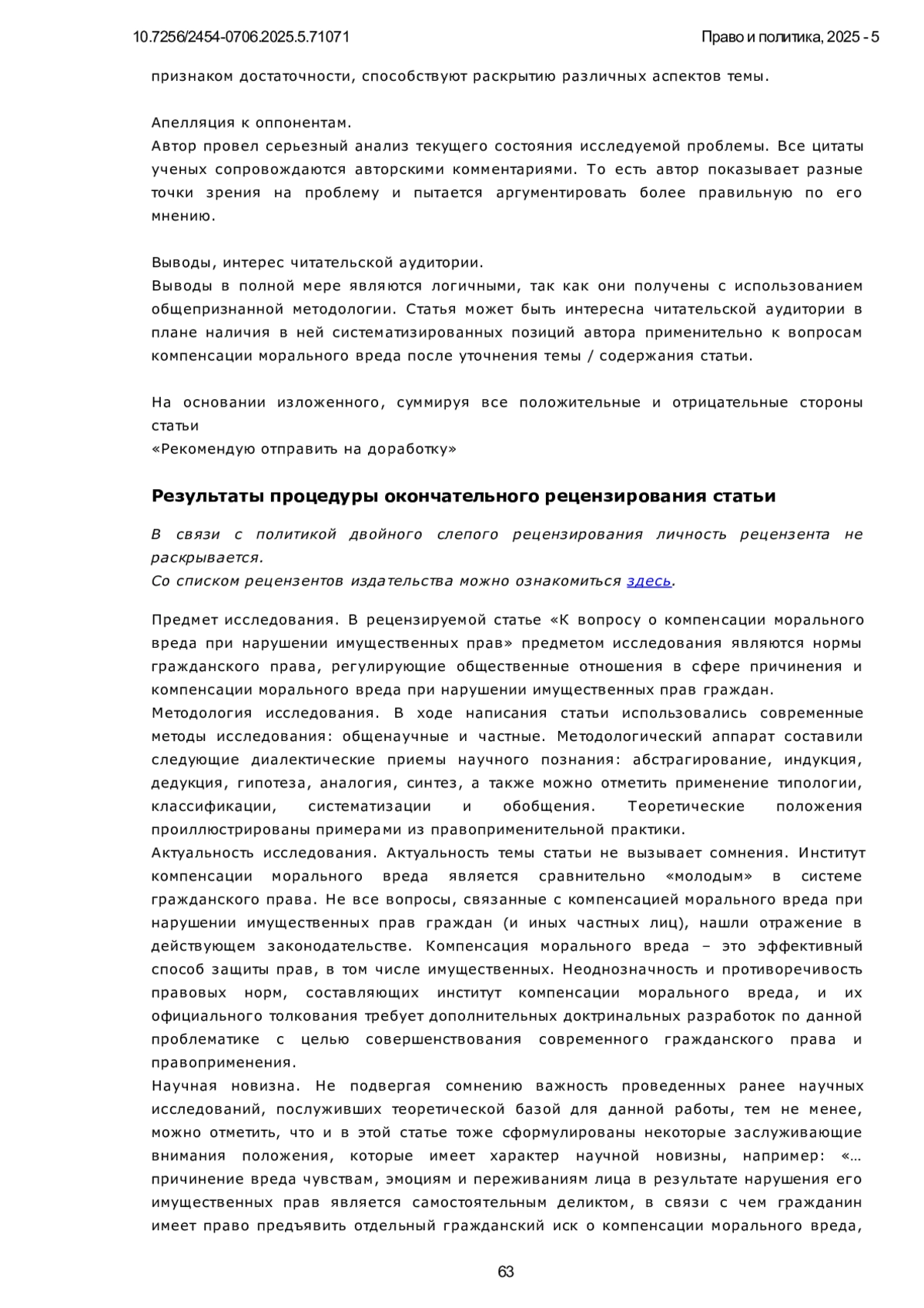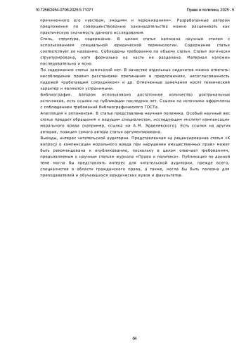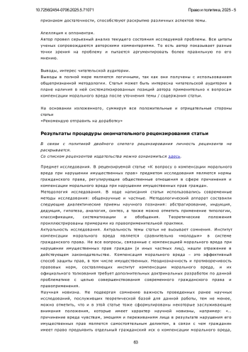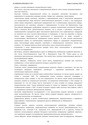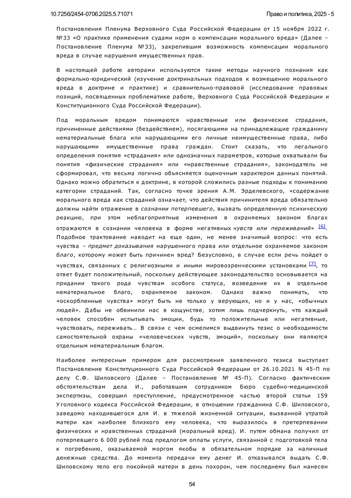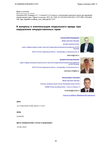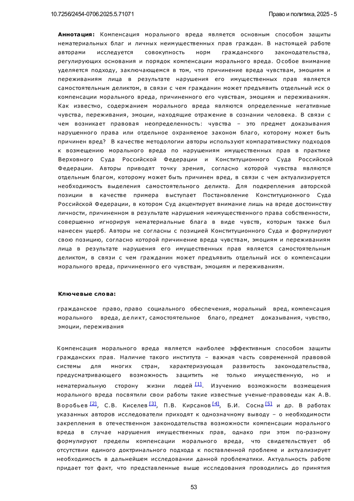 Компенсация морального вреда является основным способом защиты нематериальных благ и личных неимущественных прав граждан. В настоящей работе авторами исследуется совокупность норм гражданского законодательства, регулирующих основания и порядок компенсации морального вреда. Особое внимание уделяется подходу, заключающемся в том, что причинение вреда чувствам, эмоциям и переживаниям лица в результате нарушения его имущественных прав является самостоятельным деликтом, в связи с чем гражданин может предъявить отдельный иск о компенсации морального вреда, причиненного его чувствам, эмоциям и переживаниям. Как известно, содержанием морального вреда являются определенные негативные чувства, переживания, эмоции, находящие отражение в сознании человека. В связи с чем возникает правовая неопределенность: чувства - это предмет доказывания нарушенного права или отдельное охраняемое законом благо, которому может быть причинен вред? В качестве методологии авторы используют компаративистику подходов к возмещению морального вреда по нарушениям имущественных прав в практике Верховного Суда Российской Федерации и Конституционного Суда Российской Федерации. Авторы приводят точку зрения, согласно которой чувства являются отдельным благом, которому может быть причинен вред, в связи с чем актуализируется необходимость выделения самостоятельного деликта. Для подкрепления авторской позиции в качестве примера выступает Постановление Конституционного Суда Российской Федерации, в котором Суд акцентирует внимание лишь на вреде достоинству личности, причиненном в результате нарушения неимущественного права собственности, совершенно игнорируя нематериальные блага в виде чувств, которым также был нанесен ущерб. Авторы не согласны с позицией Конституционного Суда и формулируют свою позицию, согласно которой причинение вреда чувствам, эмоциям и переживаниям лица в результате нарушения его имущественных прав является самостоятельным деликтом, в связи с чем гражданин может предъявить отдельный иск о компенсации морального вреда, причиненного его чувствам, эмоциям и переживаниям.