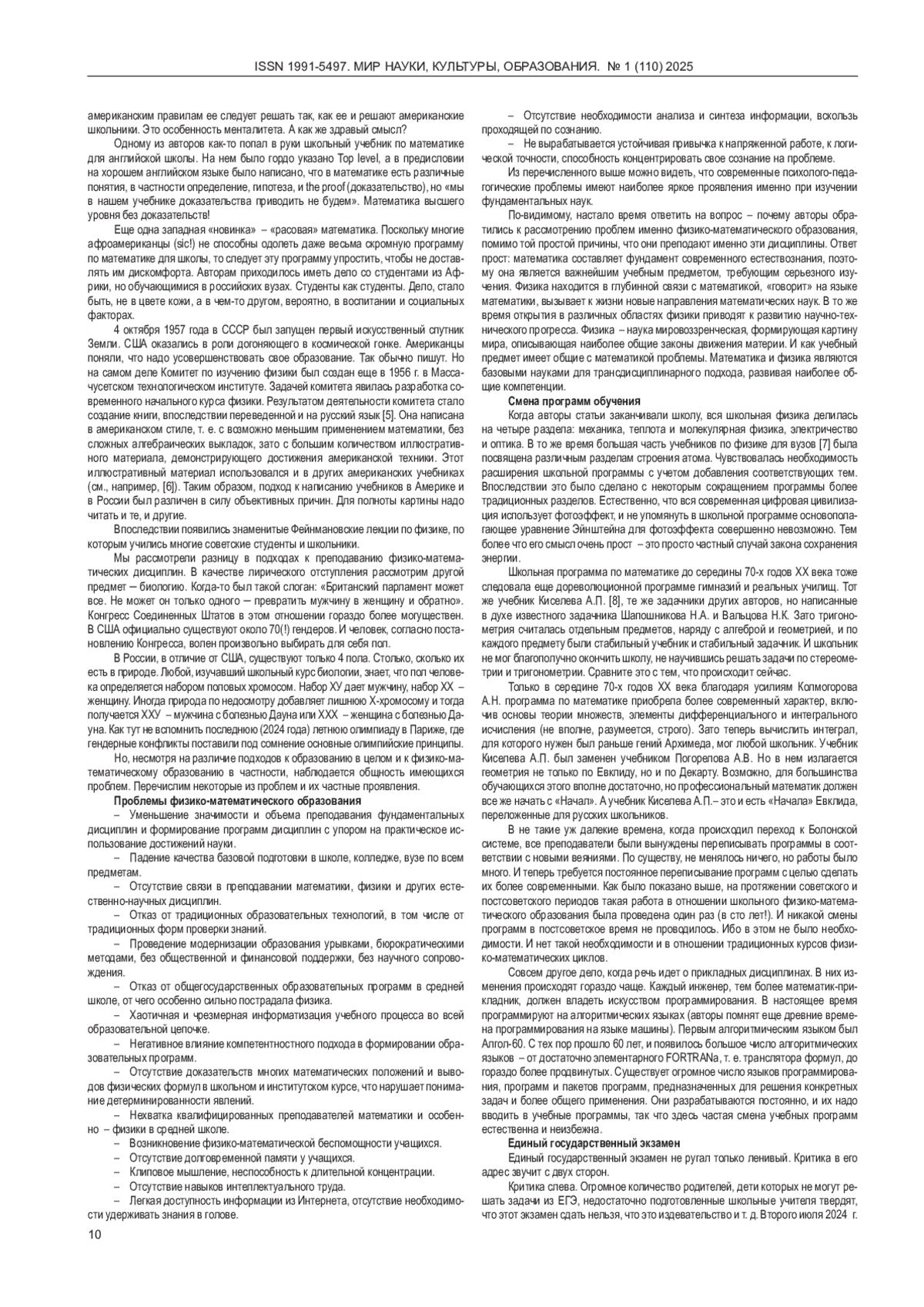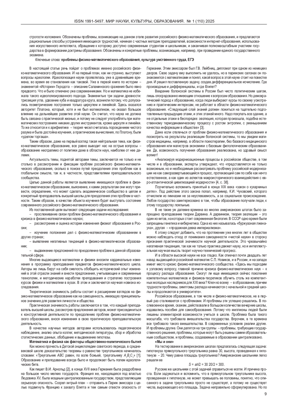Статья посвящена анализу физико-математического образования в России на всех уровнях - от начальной школы до университета. Проводится сравнение с образованием в других странах. Показано, что образование, даже такое наиболее далекое от общественно-политических проблем, как физико-математическое, неизбежно оказывается идеологизированным, и это накладывает отпечаток на все его аспекты от отбора материала до выбора степени строгости изложения. Обозначены проблемы, возникающие на данном этапе развития российского физико-математического образования, и предлагаются рациональные способы устранения имеющихся трудностей, начиная с частных методик преподавателей, возможности интернет-образования, использования искусственного интеллекта, обращение к которому доступно современным студентам и школьникам, и заканчивая полномасштабным участием государства в формировании доктрины образования. Обозначены и конкретные проблемы, возникающие, например, при проведении единого государственного экзамена.