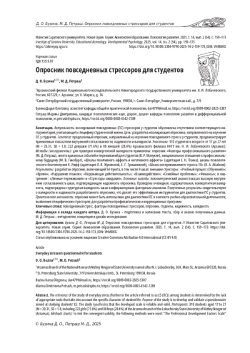 Результаты: разработан опросник, включающий 54 пункта, в том числе 9 шкал: внешние стрессоры: «Учебный процесс (Обучение)»; «Время»; «Нарушение планов»; «Окружающая действительность»; «Взаимодействие»; «Семейные проблемы»; «Финансы»; и внутренние: «Личные переживания» и «Стрессоры ожидания». Основные выводы: психометрический анализ показал высокую внутреннюю согласованность шкал, подтверждающую надежность опросника. Проведена очевидная, содержательная, конвергентная валидность, подтверждена структурная валидность шкал конфирматорным факторным анализом. Полученные результаты свидетельствуют о валидности и надежности разработанного опросника, что делает его эффективным инструментом для диагностики ПС у студентов. Практическая значимость: опросник может быть использован для диагностики ПС в контексте учебно-образовательной деятельности; выявления специфическихстрессоров; для разработки профилактических и коррекционных программ.