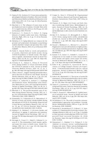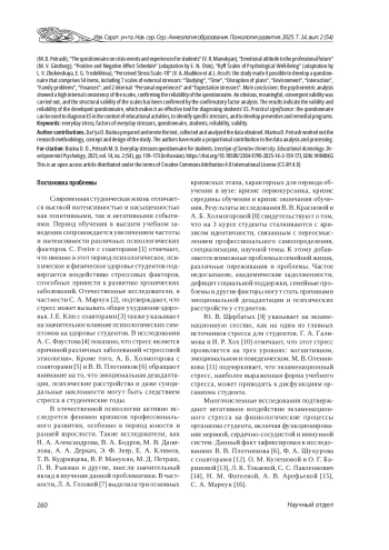 45. Абабков В. А., Барышникова К., Воронцова-Венгер О. В., Горбунов И. А., Капранова С. В., Пологаева Е. А., Стуклов К. А. Валидизация русскоязычной версии опросника “Шкала воспринимаемого стресса-10” // Вестник СПбГУ. Серия 16: Психология. Педагогика. 2016. № 2. C. 6-15 ,. DOI: 10.21638/11701/spbu16.2016.202 EDN: UALWVL
