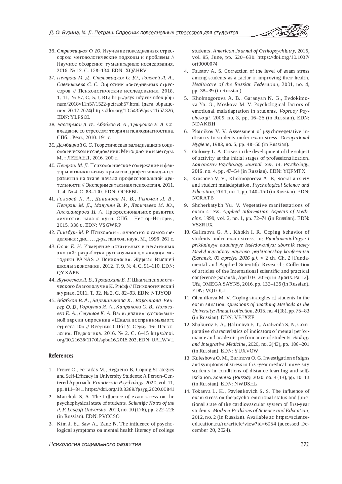 37. Петраш М. Д., Стрижицкая О. Ю., Головей Л. А., Савенышева С. С. Опросник повседневных стрессоров // Психологические исследования. 2018. Т. 11, № 57. С. 5. URL: http://psystudy.ru/index.php/num/2018v11n57/1522-petrash57.html (дата обращения: 20.12.2024) ,. DOI: 10.54359/ps.v11i57.326 EDN: YLPSOL