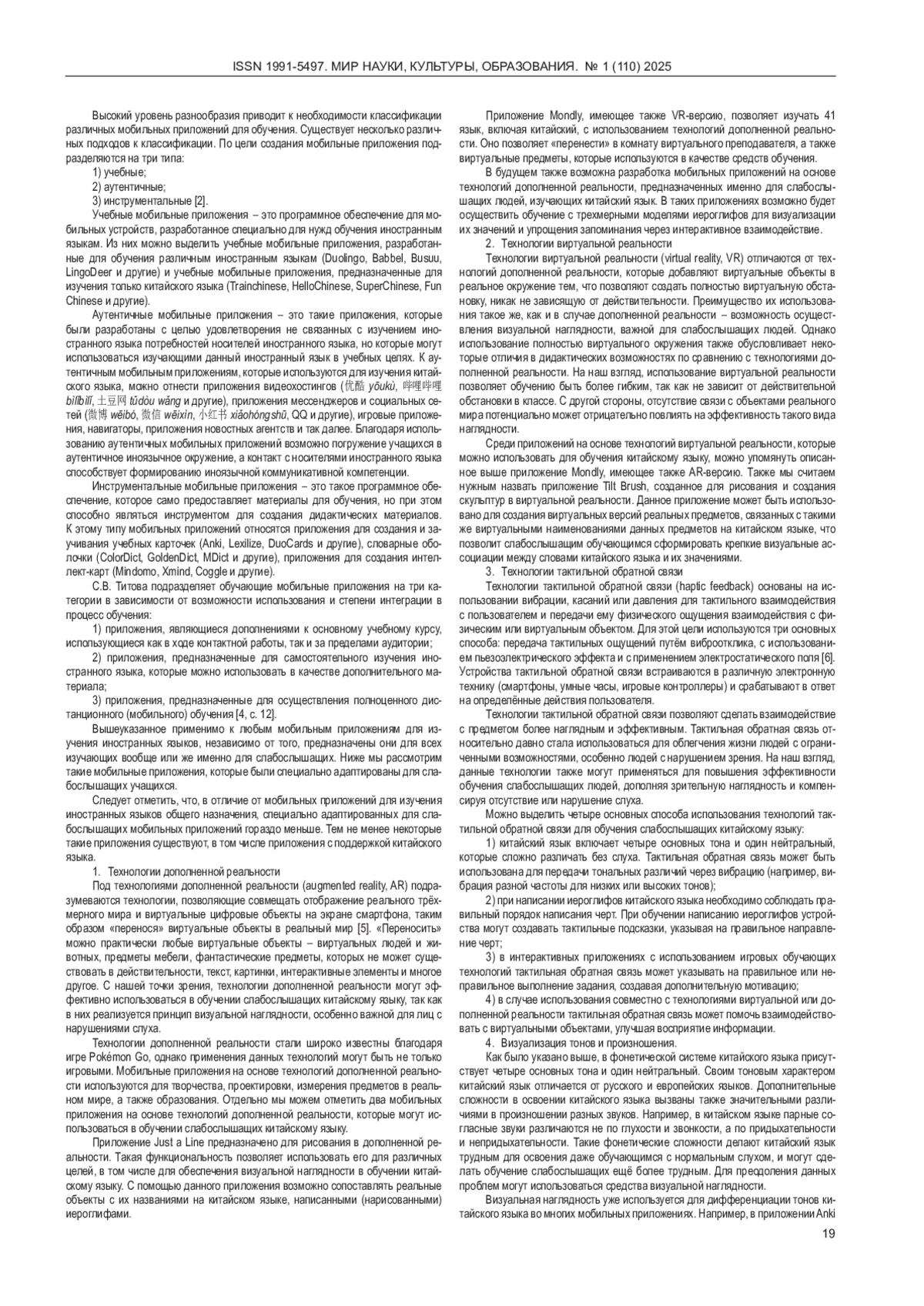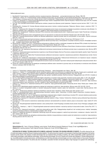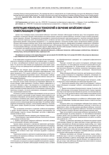 Данная статья посвящена вопросу использования мобильных технологий в обучении слабослышащих китайскому языку. Свое исследование авторы основывают на принципах обучения слабослышащих иностранным языкам и результатах анализа мобильных технологий, которые способны реализовать данные принципы в обучении. Последовательно рассматриваются технологии дополненной и виртуальной реальности, технологии тактильной обратной связи, технологии социальных сетей, использование русского и китайского жестового языка в обучении китайскому языку, визуальную дифференциацию фонетических явлений и иллюстративно доказывается то, что указанные принципы и технологии способны оказать положительное влияние на процесс обучения слабослышащих китайскому языку. Авторы также привлекают визуальную наглядность, формирование ассоциаций и динамическое отображение жестового языка к применению в методике обучения китайскому языку слабослышащих обучающихся. Представленные данные позволяют сделать вывод, что использование мобильных технологий способно повысить эффективность обучения слабослышащих китайскому языку. Результаты исследования можно использовать при разработке методик обучения слабослышащих китайскому языку.
