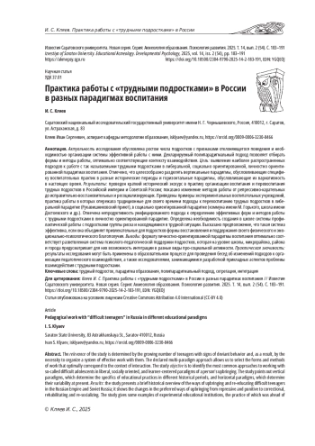 Результаты: проведен краткий исторический экскурс в практику организации воспитания и перевоспитания трудных подростков в Российской империи и Советской России; показано изменение методов работы от репрессивно-карательных до исправительно-восстановительных и ресоциализирующих. Приведены примеры экспериментальных воспитательных учреждений, практика работы в которых опережала традиционные для своего времени подходы к перевоспитанию трудных подростков в либеральной парадигме (Рукавишниковский приют), в социально ориентированной парадигме (коммуна имени М. Горького, школа имени Достоевского и др.). Отмечена непродуктивность унифицированного подхода к определению эффективных форм и методов работы с трудными подростками в личностно ориентированной парадигме. Определена необходимость создания в школе системы профилактической работы с подростками группы риска и находящимися в трудной ситуации. Высказано предположение, что такая система эффективна, если она объединяет привлекательные для подростков формы восстановления и поддержания своего физического и эмоционально-психологического благополучия.