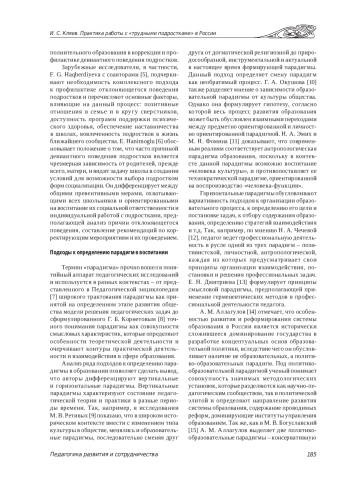 Цель: выявление наиболее распространенных подходов к работе с так называемыми трудными подростками в либеральной, социально ориентированной, личностно ориентированной парадигмах воспитания. Отмечено, что целесообразно разделять вертикальные парадигмы, обусловливающие специфику воспитательных практик в разные исторические периоды и горизонтальные парадигмы, обусловливающие их вариативность в настоящее время.