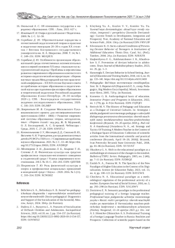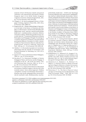 19. Скрябина Д. Ю. Особенности организации образовательной среды отечественных вспомогательных школ в первой половине XX века: социально-культурологический подход // Проблемы и перспективы развития современного образования в контексте его историко-педагогической интерпретации: сборник научных трудов Международной научно-практической конференции - XXХIII сессии Научного совета по проблемам истории образования и педагогической науки при отделении философии образования и теоретической педагогики Российской академии образования (Санкт-Петербург, 29-30 октября 2020 г.). СПб.: Волгоградская государственная академия последипломного образования, 2020. С. 316-319. EDN: DILMIP