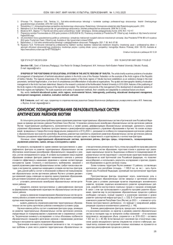 В статье кратко рассмотрены проблемы оценки управления развитием территориальных образовательных систем в Арктической зоне Российской Федерации на примере арктических районов Республики Саха (Якутия). Установлено региональное своеобразие образовательных систем арктических районов Якутии: территориальная разобщенность, малокомплектность и низкий уровень дифференциации образовательных организаций, удаленность органов управления образованием. Выявлена пространственная и демографическая маркированность управления образованием в Арктике. На основе исследований, проведенных в Северо-Восточном федеральном университете в 2012-2024 гг., раскрываются особенности позиционирования арктических районов в образовательном пространстве республики. Выделены доминантные компоненты управления развитием образовательных систем арктических районов. Показаны расширение масштаба и разнообразие используемых методов оценки, их вариативность и адаптируемость к контекстным факторам.