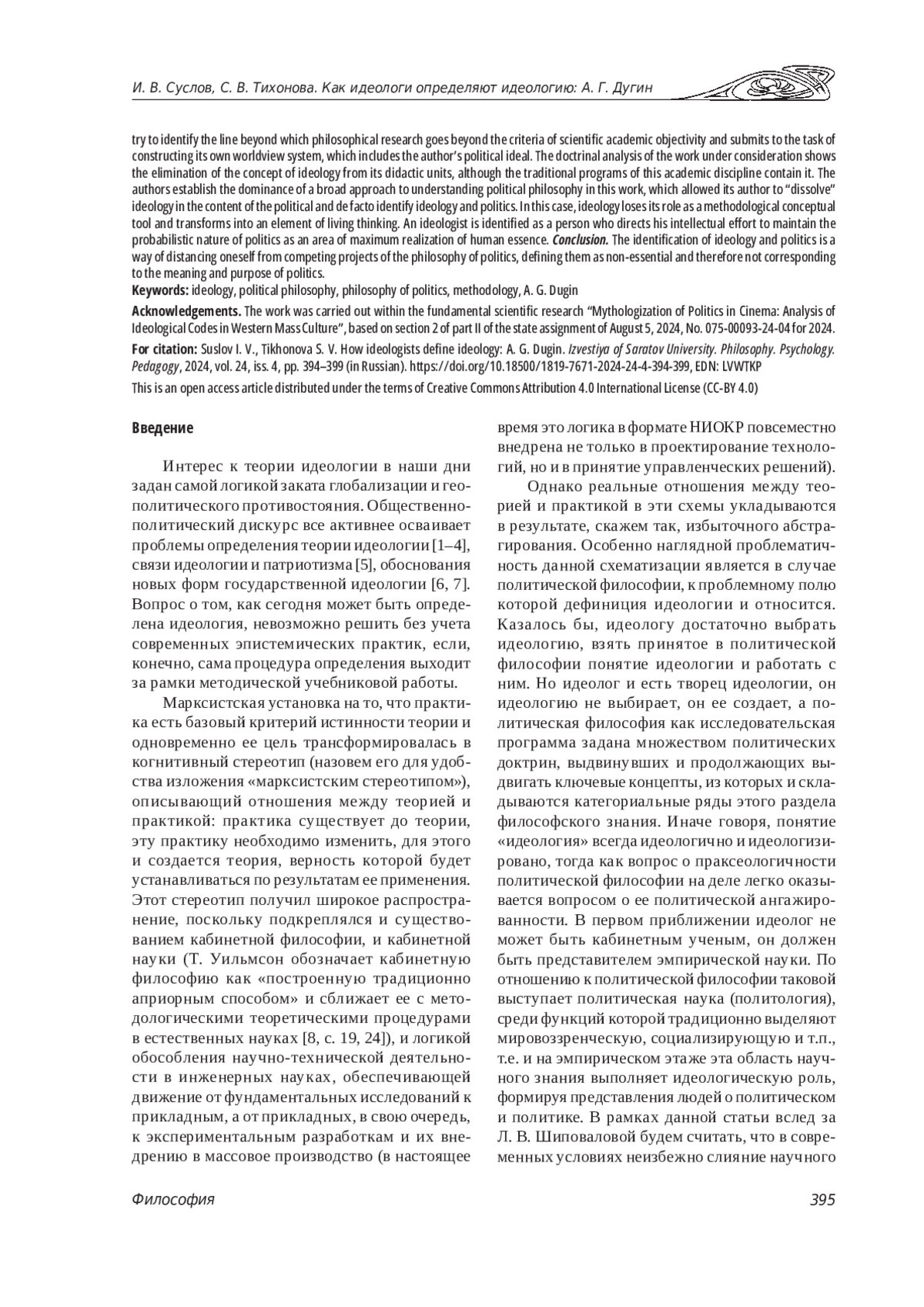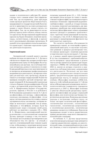 Введение. Идеология как категория политической философии в условиях цифрового общества не может определяться нейтрально и автономно от деятельности определяющего ее субъекта. Теоретический анализ. На примере конкретной системы взглядов показана неизбежность идеологичности и идеологизированности понятия «идеология». При рассмотрении учебника А. Г. Дугина «Философия политики» предпринята попытка выявить ту грань, за которой философское исследование выходит за критерии научной академической объективности и подчиняется задаче конструирования собственной мировоззренческой системы, включающей в себя авторский политический идеал. Доктринальный анализ настоящей работы показывае тэлиминацию концепта идеологии из его дидактических единиц, хотя традиционные программы данной учебной дисциплины ее содержат. Устанавливается доминирование широкого подхода к пониманию политической философии в данной работе, позволивший ее автору «растворить» идеологию в содержании политического и де факто отождествить идеологию и политику. В этом случае идеология теряет роль методологического концептуального инструмента и трансформируется в стихию живого мышления, что выявляют идеолога, направляющего свое интеллектуальное усилие на удержание пробабилистического характера политики как области максимальной реализации человеческой сущности.