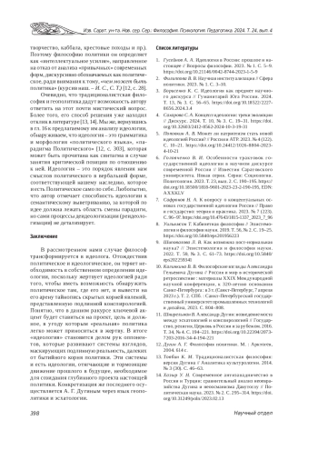 6. Головченко В. И. Особенности трактовок государственной идеологии в научном дискурсе современной России // Известия Саратовского университета. Новая серия. Серия: Социология. Политология. 2023. Т. 23, вып. 2. С. 190-195. ,. DOI: 10.18500/1818-9601-2023-23-2-190-195 EDN: AXXKLV