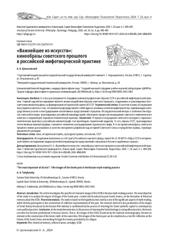 Введение. В статье рассматривается специфика кинематографических образов СССР в российской мифотворческой практике. Главной задачей исследования является анализ воздействия образов советского прошлого, создаваемых и транслируемых постсоветским кинематографом, на формирование исторической памяти об СССР. Теоретический анализ. В качестве основы исследования была принята гипотеза о том, что кинематограф представляет собой один из значимых аспектов мифотворчества, принимающих непосредственное участие в конструировании коллективных представлений о прошлом. Исследовательский интерес к особенностям образов советской истории, транслируемых российской киноиндустрией, обусловлен процессом возвращения советского символического капитала в современную социально-политическую практику.