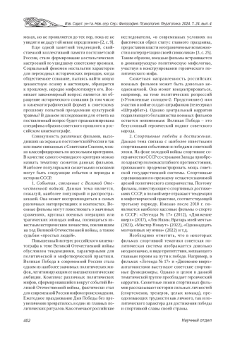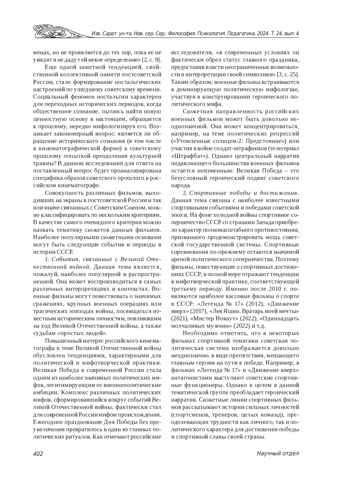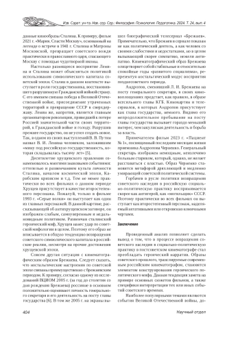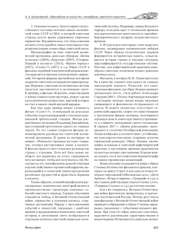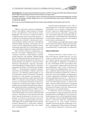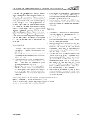 Заключение. В процессе возращения советского наследия в социальнополитическую практику в российском кинематографе стал преобладать героический нарратив. То есть образы СССР, транслируемые отечественным кинематографом, становятся элементом конструирования героического мифа. В то же время кинообразы советского прошлого можно рассматривать в качестве инструмента рефлексии над историей Советского Союза и проработки травмы, спровоцированной его распадом.