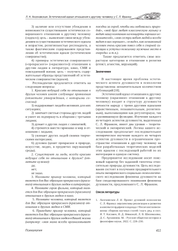Введение. В статье представлен социально-психологический (ордерный) подход к исследованию эстетического аспекта духовности. В соответствии с представлениями С. Л. Франка о четырехаспектности феномена духовности построена вербальная социально-психологическая модель эстетического идеала отношения к другому человеку, на базе которой разработана опросная методика (анкета) для изучения представлений об эстетическом идеале отношения к другому человеку у респондентов разного возраста. Теоретический анализ. Выполнен краткий обзор истории формирования эстетики как самостоятельной науки, даны определения основных категорий эстетики (прекрасное, красота), показаны ее связи с научной психологией как на уровне исторических прецедентов разработки психологических эстетических концепций, так и на уровне понятийного аппарата (эстетическое сознание, эстетическое восприятие, эстетическое отношение, эстетические ценности, эстетический идеал). В представленной теоретической модели эстетического идеала отношения к другому человеку моделеобразующим параметром выступает отношение. В структуре модели выделены шесть основных параметров: 1) поддерживает людей в неловких для них ситуациях; 2) замечает светлые стороны других людей и умеет их подчеркнуть в общении с третьими лицами; 3) думает о других людях с симпатией; 4) стремится внести гармонию и мир в отношения с людьми; 5) увлекает других людей своими творческими интересами; 6) духовен (ценит прекрасное в природе, искусстве, людях, в предметах окружающей среды). Эмпирический анализ (разработка методики исследования). Методика исследования эстетического идеала отношения к другому человеку разработана на базе параметрической ранее описанной модели. Данная опросная методика представляет собой комбинированную анкетус открытыми и закрытыми вопросами. Цель открытых вопросов состоит в уточнении субъективных представлений респондентов о прекрасном (красивом) в отношении к другим людям за счет предоставления наглядных примеров проявления этих качеств во взаимодействии людей.