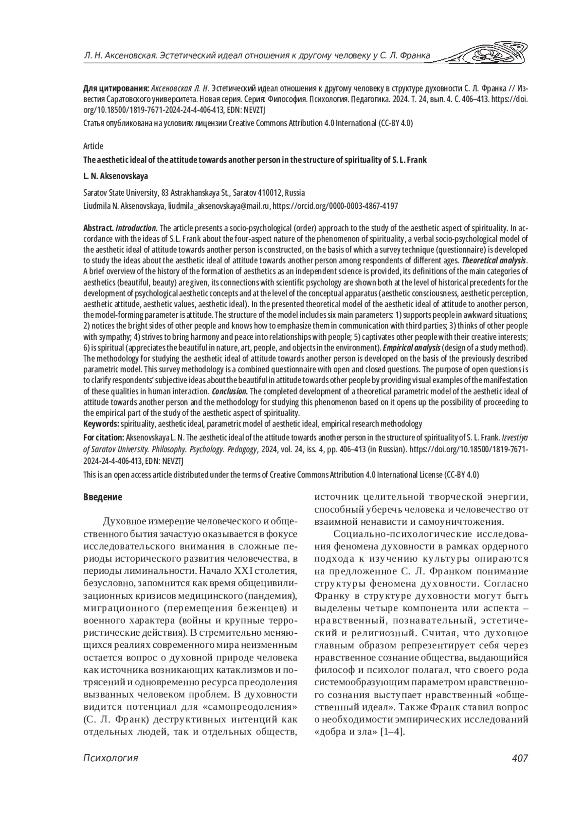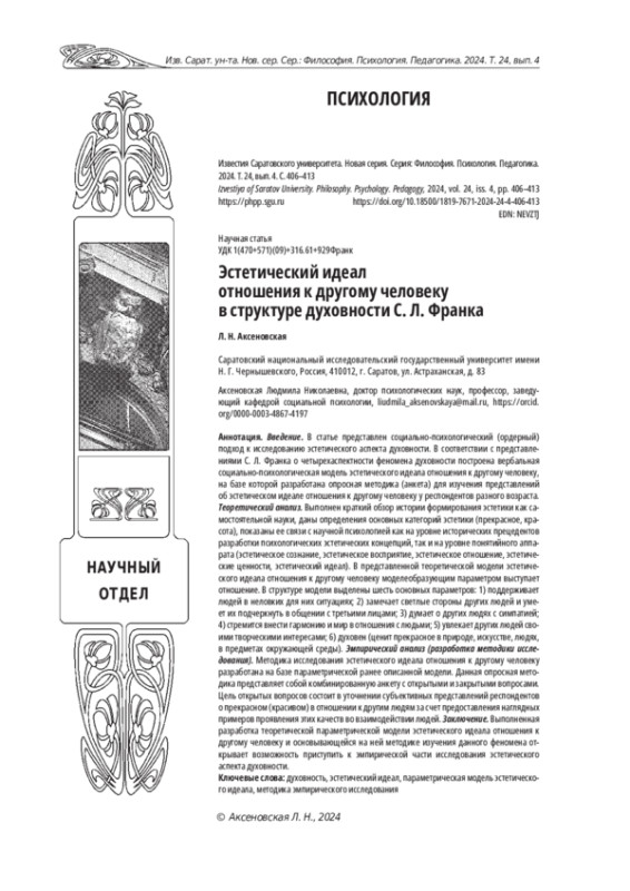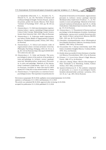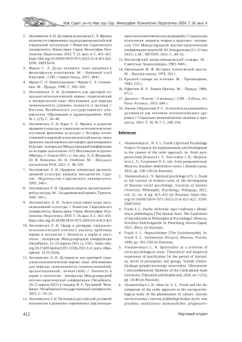 2. Аксеновская Л. Н. Духовная психология С. Л. Франка в контексте современных задач развития российской социальной психологии // Известия Саратовского университета. Новая серия. Серия: Философия. Психология. Педагогика. 2022. Т. 22, вып. 4. С. 413-422. ,. DOI: 10.18500/1819-7671-2022-22-4-413-422 EDN: ZMYDAN