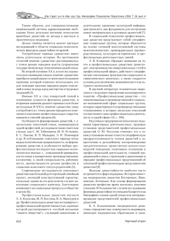 Во Введении обозначена проблема трансформации медицинской профессии в современном обществе, что имеет как свои плюсы, так и минусы. Одними из минусов являются риски потери накопленного предыдущими поколениями опыта и кадровый кризис в области медицины. Отмечается возможность уменьшения рисков через поддержку продолжения социального института профессиональной медицинской династии и изучение ее социально-психологических факторов. Теоретический анализ включает общий обзор исследований феномена династий и его характерной представленности в области медицины. Проведенный анализ существующих научных исследований позволил сделать выводы об отсутствии упорядоченных научных фактов о закономерностях формирования и социально-психологических факторах профессиональной династийности в области медицины. Предлагается рассматривать профессиональные династии в социальной психологии как специфичные социальные группы, которые образуются на основе сложной многоплановой системы межпоколенческих, примордиальных (кровнородственных), культурно-исторических и профессионально-деятельностных связей. Заключение касается необходимости проведения научных исследований в области социально-психологических факторов формирования мотивации продолжения последующим поколением медицинской профессии родителей, социально-психологических механизмов передачи профессионального опыта и способов психологической толерантности к возникновению эмоционального выгорания в династиях врачей.