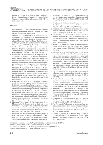 15. Панфилова Ю. С. Поколенческие особенности восприятия профессиональных династий медицинскими работниками Ростова-на-Дону // Государственное и муниципальное управление. Ученые записки. 2021. № 4. С. 225-233. EDN: EGTJIB