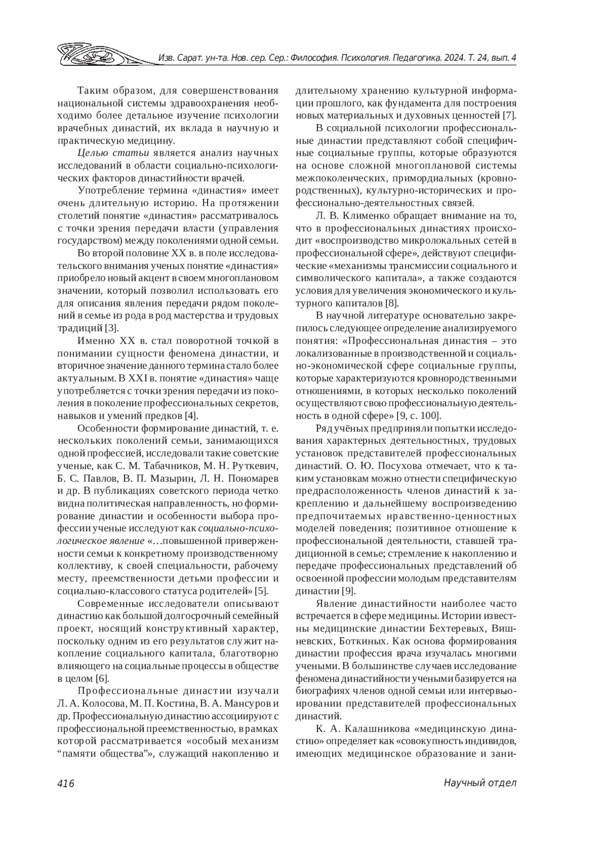 8. Клименко Л. В., Посухова О. Ю. Профессиональные династии в бизнесе: специфика и потенциал развития // Мир России. 2020. Т. 29, № 1. С. 80-102. EDN: FGCHEU