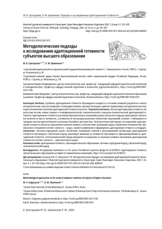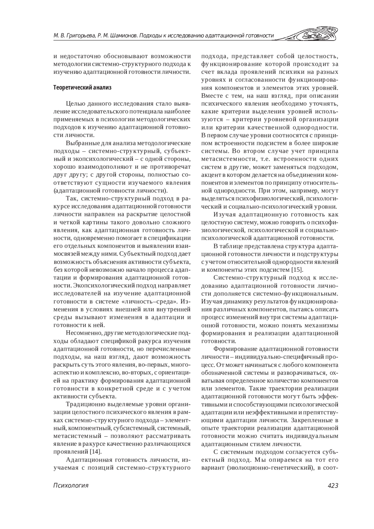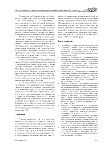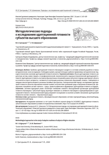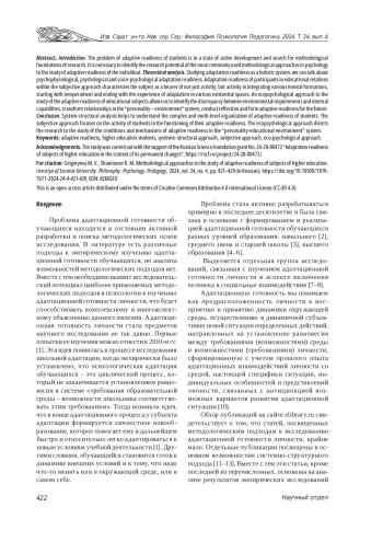 Заключение. Системно-структурный анализ способствует пониманию сложной и многоуровневой организации адаптационной готовности обучающихся. Субъектный подход акцентирует внимание на активности обучающихся в функционировании их адаптационной готовности. Экопсихологический подход направляет исследование на изучение условий и механизмов адаптационной готовности в системе «личность – образовательная среда».