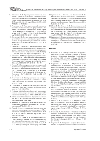 13. Шамионов Р. М. Структура адаптационной готовности личности // Известия Саратовского университета. Новая серия. Серия: Философия. Психология. Педагогика. 2016. Т. 16, вып. 4. С. 454-458. DOI: 10.18500/1819-7671-2016-16-4-454-458 EDN: XWOMCL