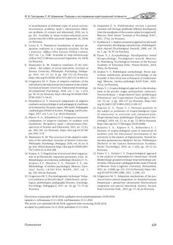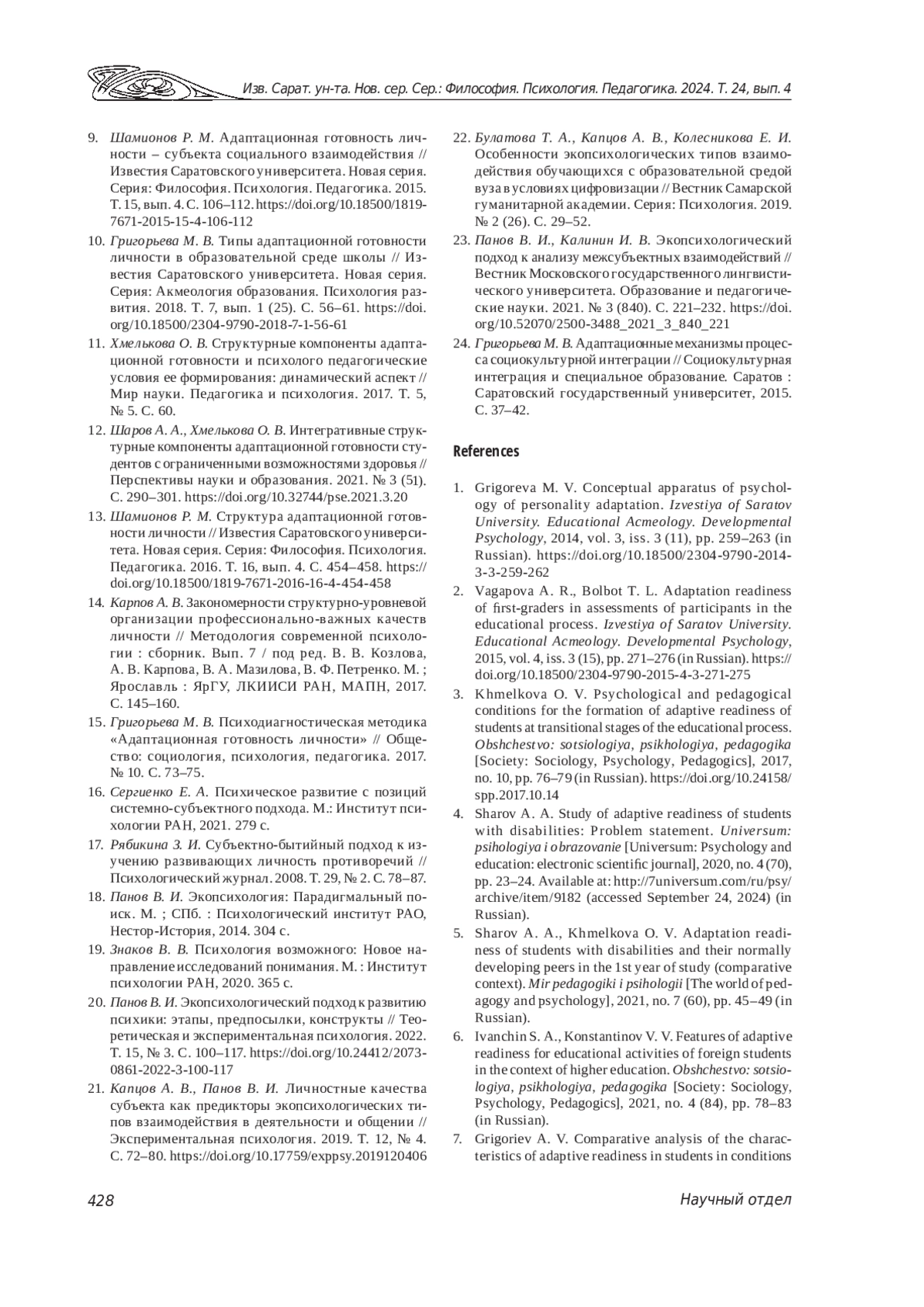9. Шамионов Р. М. Адаптационная готовность личности - субъекта социального взаимодействия // Известия Саратовского университета. Новая серия. Серия: Философия. Психология. Педагогика. 2015. Т. 15, вып. 4. С. 106-112. DOI: 10.18500/1819-7671-2015-15-4-106-112 EDN: VOJRIZ