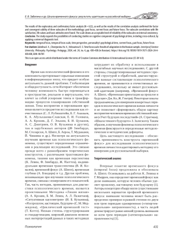 Введение. Несмотря на актуальность изучения психологического времени, в современном мире имеют место методологические проблемы, ограничивающие исследования в данном направлении. Это обусловило цель работы – обосновать применимость конструкта «временной фокус» для исследования психологического времени личности и адаптировать методику его измерения для русскоязычной выборки. Теоретический анализ позволил обнаружить несколько методик, диагностирующих представление личности о настоящем, прошлом и будущем, в том числе оригинальную методику для исследования временного фокуса. Эмпирический анализ. Подробно изложена процедура адаптации опросника на российской выборке. Результаты эксплораторного и конфирматорного факторного анализа (N = 622), а также результаты корреляционного анализа подтвердили факторную и конвергентную валидность трех шкал методики: фокус на прошлом, фокус на настоящем и фокус на будущем. Обнаружены интерпретируемые корреляции субшкал с уровнем удовлетворенности жизнью, с жизненными ценностями и базисными установками. Шкала показывает приемлемый уровень надежности шкал по внутренней согласованности. Заключение. Настоящее исследование расширяет возможности проведения исследований когнитивного компонента психологического времени, в том числе кросскультурных, за счет применения в них валидного универсального диагностического инструмента.