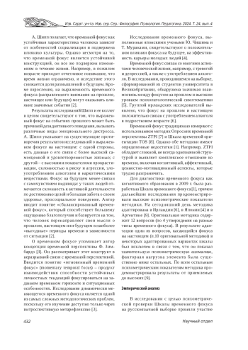 4. Chishima Y., McKay M. T., Murakami T. The reliability and validity of the Temporal Focus Scale in young Japanese adults // Personality and Individual Differences. 2017. Vol. 119. P. 230-235. DOI: 10.1016/j.paid.2017.07.031 EDN: YGPBLY
